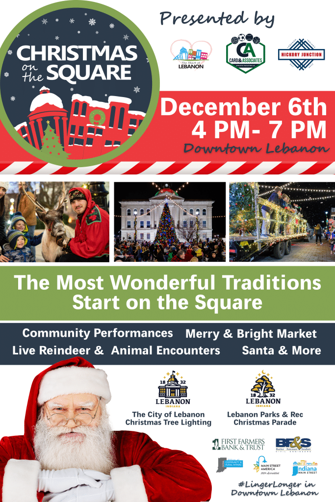 Come home to Downtown Lebanon on December 6th from 4:00 p.m. to 7:00 p.m. as our community gathers to celebrate Christmas on the Square presented by Card & Associates and Hickory Junction.