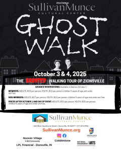 This October, the streets of historic Zionsville come alive with tales from the past. The SullivanMunce Cultural Center invites you to experience the 23rd edition of GhostWalk—a family-friendly, guided walking tour filled with spirited storytelling and eerie reenactments based on local legends and lore.